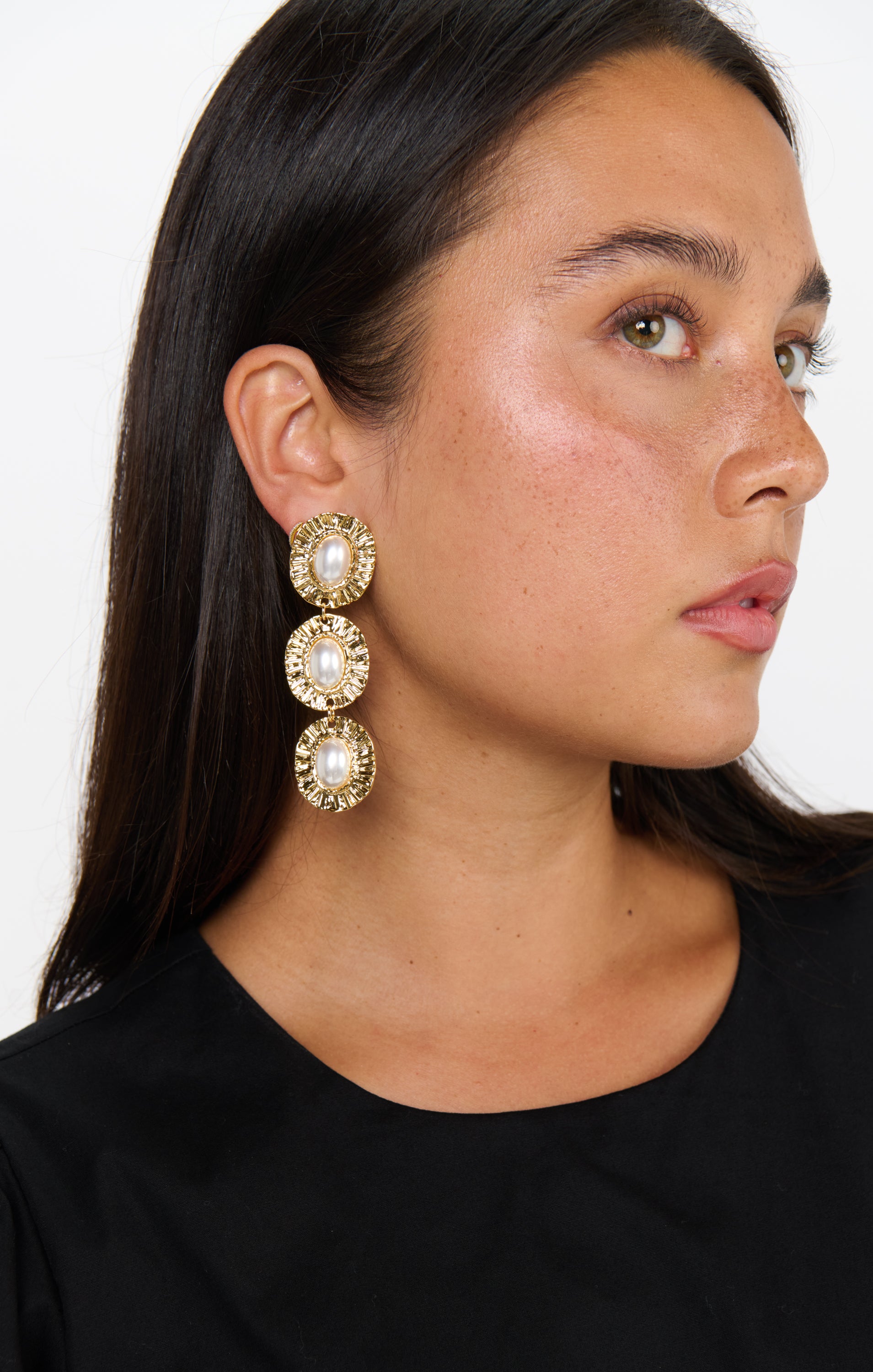 Make a statement in these bold gold and pearl earrings, perfect for bridal moments or any dressed-up night out!